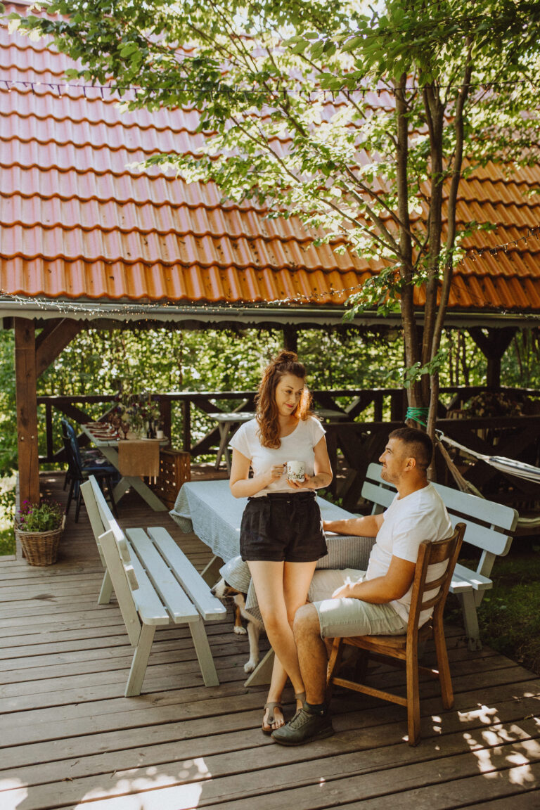 Obiad w altanie z zieloną ścianą drzew jako „ścianką za młodymi”, sesja zdjęciowa